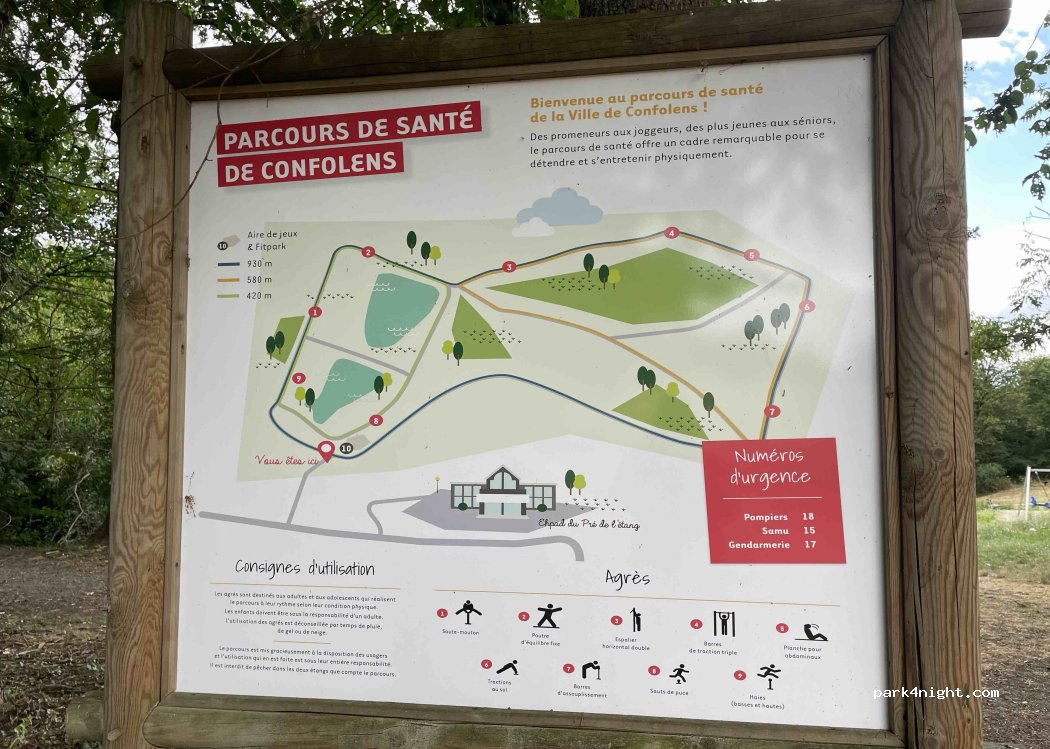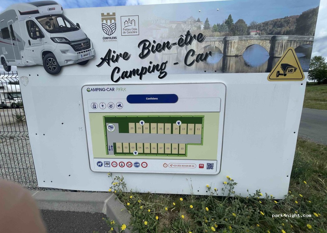 Well-being Area Motorhome located in Confolens, a small City of Character. On the Niort / Limoges and Angoulême / Bellac axis Slightly removed from the road, quiet and close to all shops (gas station, supermarket, pharmacy, a gym. Ideal for taking a break while visiting Confolens. In summer there is has free concerts every Friday evening, local farmers' markets (many in the region) and in August an International folklore festival. Very beautiful walks to do on foot or by bicycle. 22 locations 3 electric terminals of recharge 1 emptying station