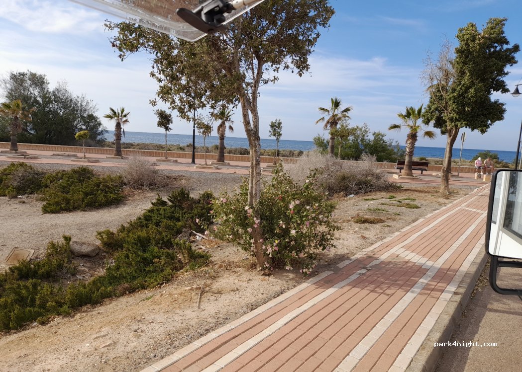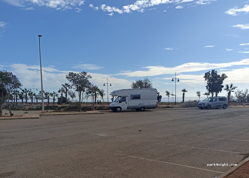 Buen sitio, llano, asfaltado, junto a paseo maritimo, parte final del mismo Suficientemente alejado del centro para estar más tranquilo, No sacar nada fuera del vehículo, para pasar desapercibido, pasa la policía de vez en cuando, pasan ojean y se marchan.