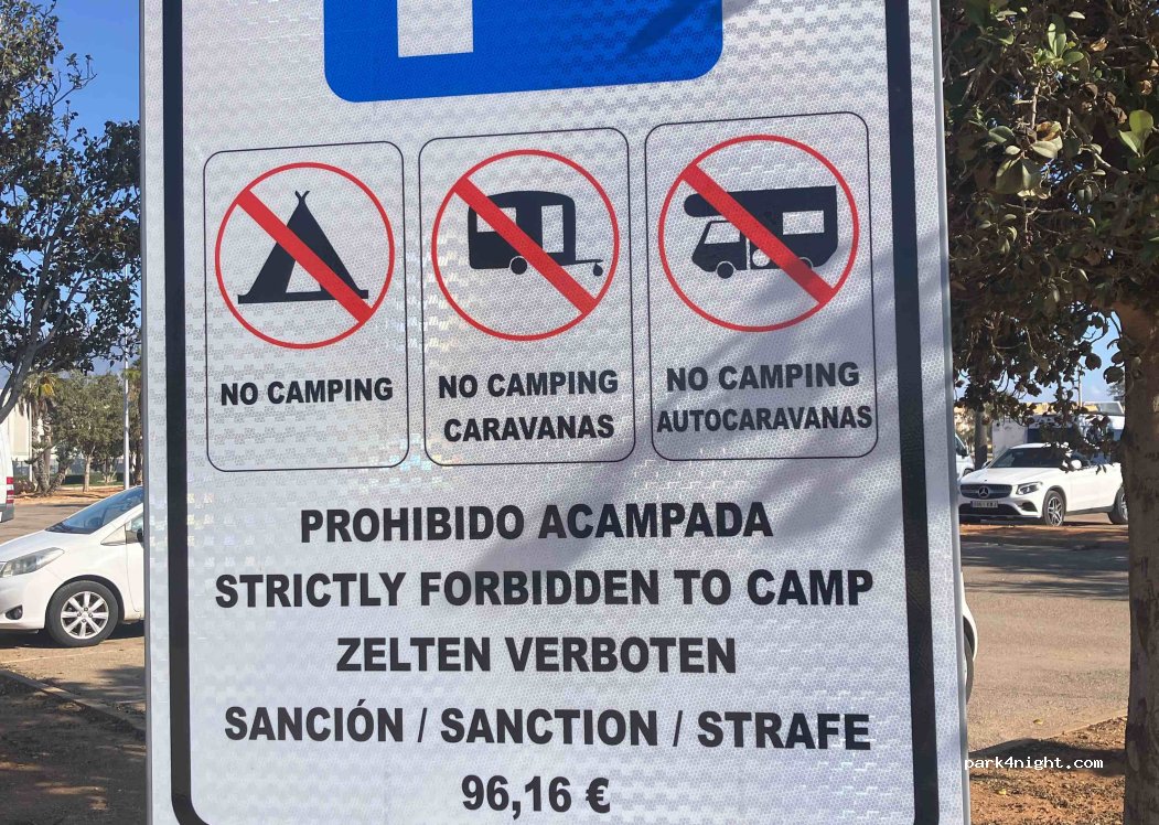 Wie überall in dieser Gemeinde stehen auch hier Schilder, die eindeutig, dass übernachten und campieren unter Androhung einer hohen Geldstrafe verbieten. Tagsüber kann man hier sicherlich gut stehen, auch um zu surfen. Abends sollte man den Platz verlassen, wenn man keine Lust hat sehr viel Geld zu bezahlen.