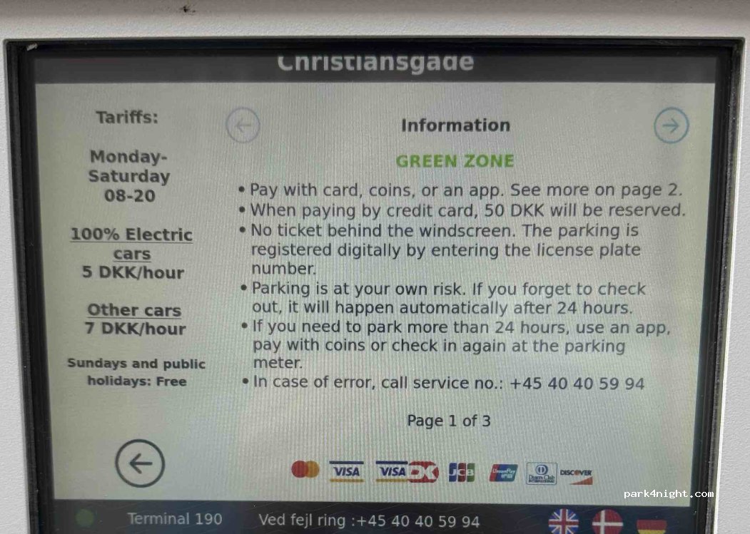 zwischen 8-20 Uhr 5Dkk/ Stunde. perfekt um die Stadt zu erkunden. in den angrenzenden Straßen darf auch 1h mit Parkuhr gestanden werden.