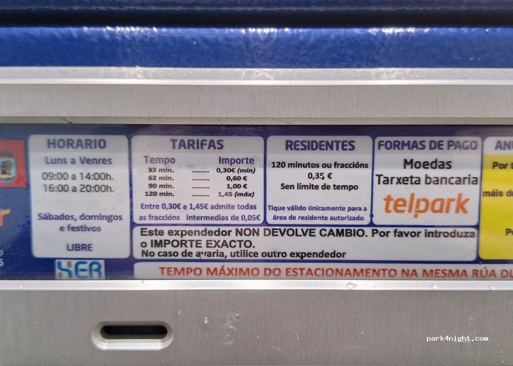 Zona azul, máximo dos horas 1.30€. Se aparca en batería solo adecuado para campers o autocaravanas pequeñas. Muy cerca del centro.