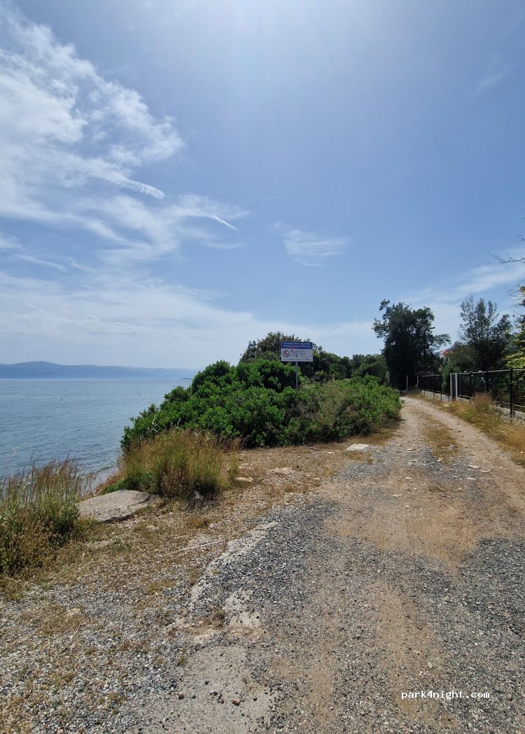 Kleiner Schotterplatz. Relativ eben. Gut für eine Nacht. Direkt am Strand mit Bademöglichkeit. Bitte kein Campingverhalten zeigen! Auf der anderen Straßenseite sind Wohnhäuser. Der Platz ist in einem Wohngebiet.