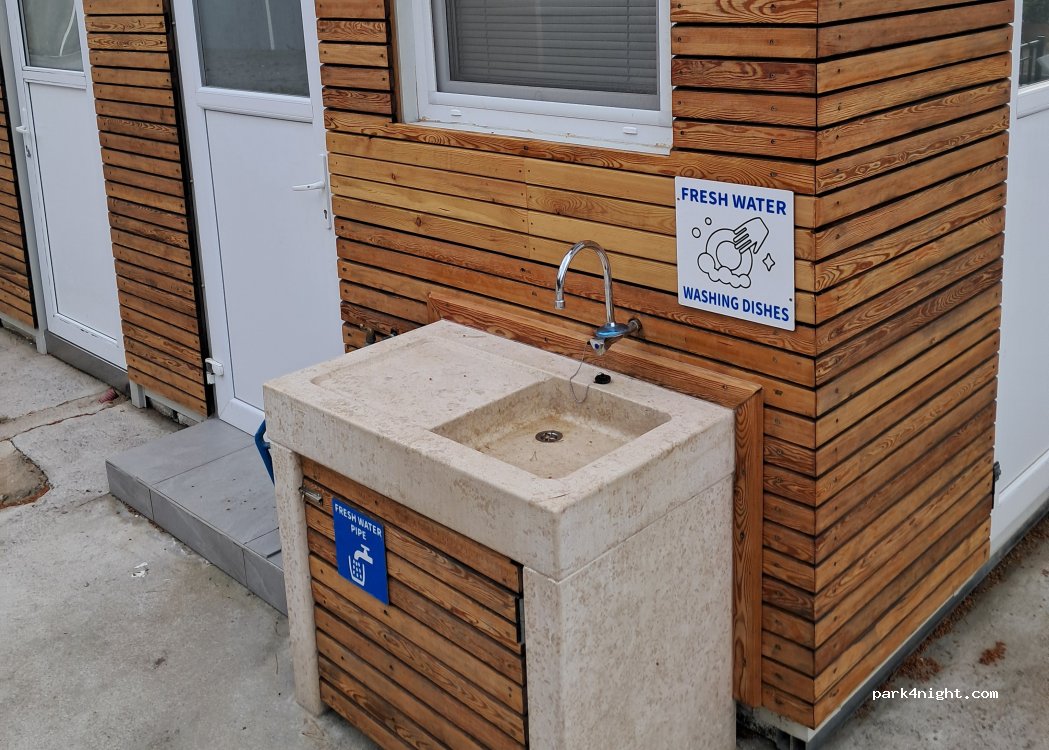 Cheaper than the camper area on the meadow or the camping next. But you’re only on a parking space and 35€ for what you have is relatively expensive. We stayed one night to have a swim and visit Piran. At night a few drunk people walked along (getting to or from the beach) and few had a Bluetooth speaker on and loud… public toilets (shared with beach and pizzeria guests) and cold shower available.