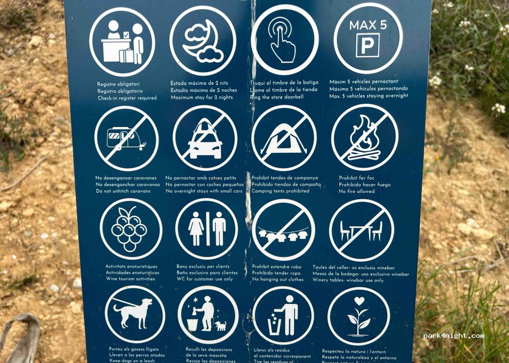 Aparcamiento en parcela para acceder al celler. Si visitas el celler te permiten pernoctar. Puedes acceder a agua potable pero no para llenado de deposito. Una experiència muy enriquecedora la cata y visita a los viñedos muy agradable el personal muy atento. Acceso asfaltado y bastante amplio sin problemas para acceder con una AC de 8mts. experiència de 10!