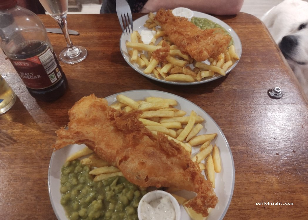 Nice flat spot, we had to buy a pint and food to stay so it worked more expensive than staying at a campsite. Food was good we had a couple of sides. Other customers had the roast and potions weee HUGE!