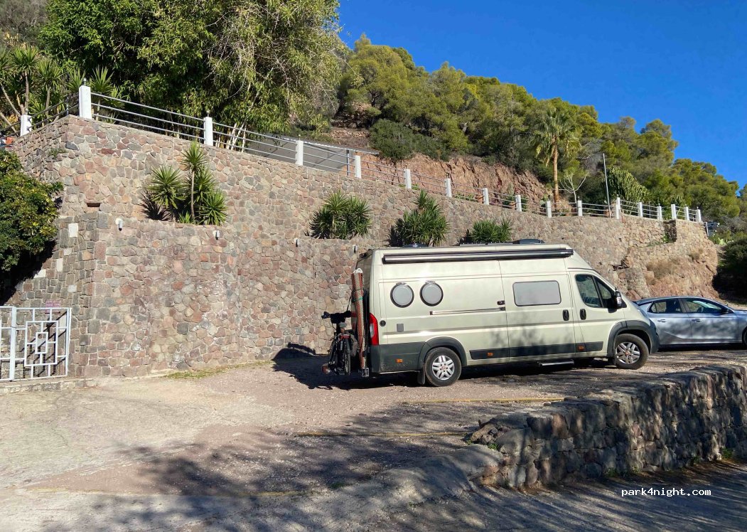 The parking lot is below a club. It's quite sloping, but we were able to compensate for it with wedges. The club is closed in the off-season. Below is a sandy beach with warm spring water. A trash can is also in place. The view is very nice on the Peloponnese. There is a shower on the beach.