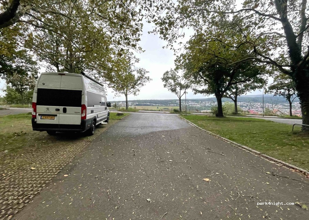 Im Prinzip ein guter Platz mit schöner Aussicht über die Stadt! Man kann in etwa 20 Minuten in die Stadt runter laufen.Minuspunkte: 1) ziemliche Schräglage 2) der Parkplatz wird bis ca 23 Uhr von jungen Erwachsenen in ihren Autos als Treffpunkt genutzt, also laute Gespräche und teils Musik.