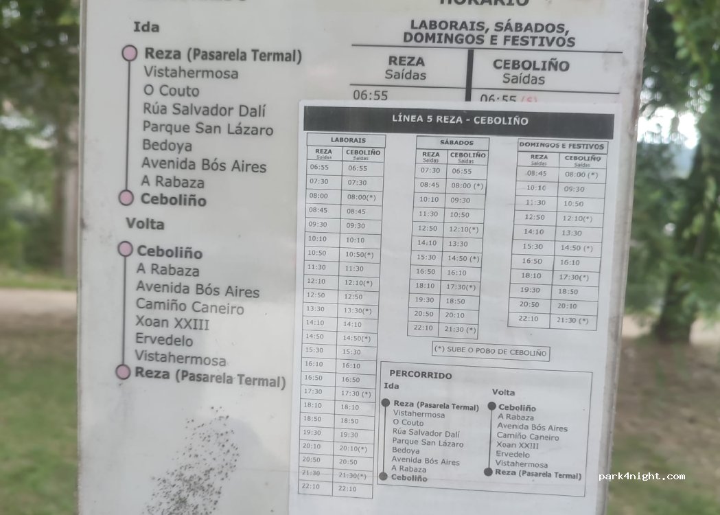 Circa 10 posti per parcheggiare, pavimento sterrato sulle rive del fiume, di fronte alle terme di Outariz, posto tranquillo a un chilometro dalle terme, parcheggio per visitarle, autobus ogni tanto per andare al centro di Ourense, lì è anche un trenino che parte dalle terme