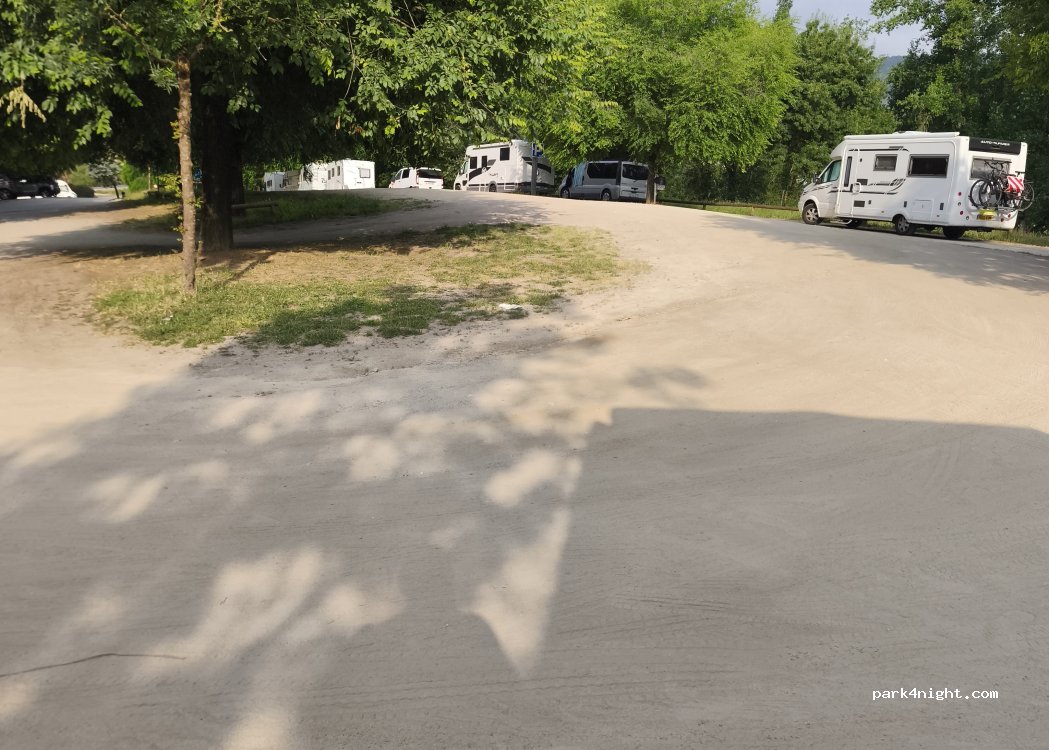 Aparcamiento para día y noche sin servicios. El suelo es de tierra. Está siempre bastante lleno compartido entre autocaravanas y coches, pero hay mucho movimiento y se consigue aparcar sin problema. Dormimos una noche y fue muy tranquilo. Hay autobús hasta el centro de la ciudad y está al lado de las termas.