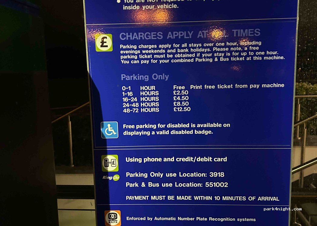 Great option for visit to Oxford. £4 for 16hrs parking & includes bus ticket for p&r or 15min walk into town. If you use app location code to include bus ticket (551002) Only let down was terminal building closes overnight, which has the toilets but McDonald's a 5min walk away which opened at 6am, and beware of height restriction barrier. All in all would recommend and will use again.