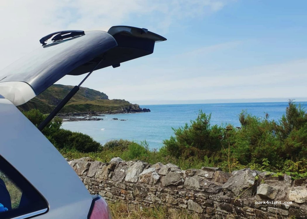 Parking un peu en pente juste au-dessus des vagues. J'y ai passé une nuit de (petite) tempête le 26/07/2015. Génial ! Pas une voiture avant 8h45 ! Ici on capte les réseaux GB, gare au Roaming !