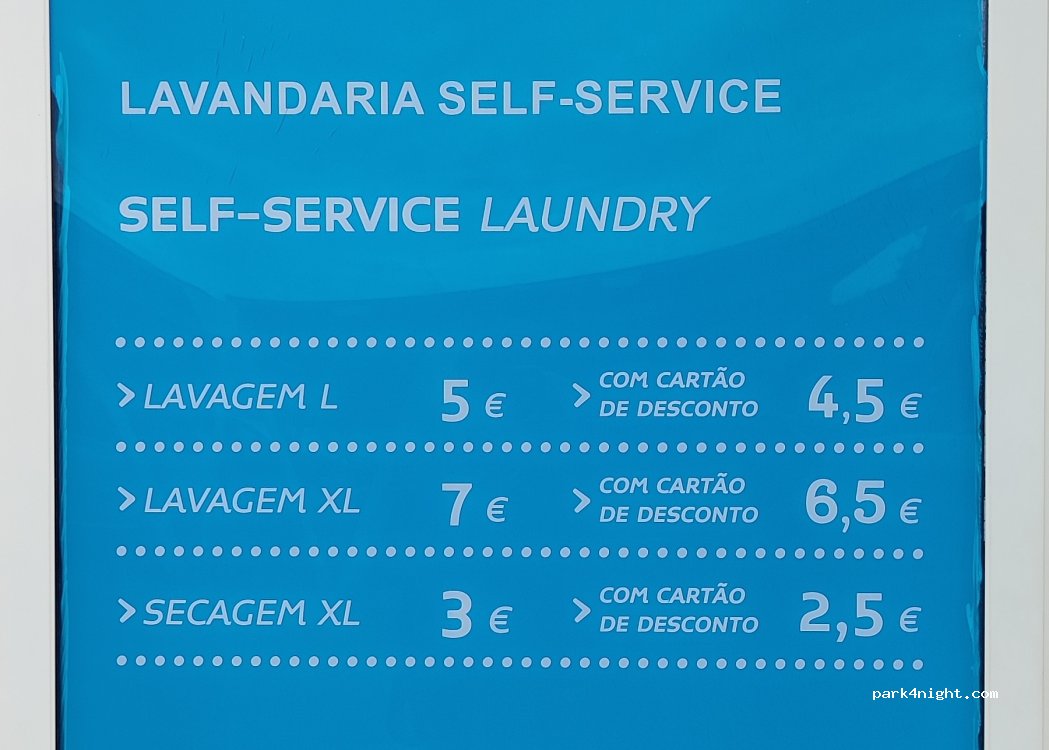 Good clean good value laundry facilities. 2 small one large washer and two dryers. Not much space inside area if more than two people using. Now 7euro for large machine 5 euro for 9kg and 3euro for 20 mins drying. All worked well and machine takes coins and notes and gives change. Two dedicated parking spaces for motorhomes at end of parking area. Large well stocked supermarket.