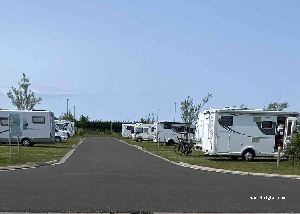 A really nice aire. Easy online booking with pitch selction and barcode access. Spaces on blocked grass, the sort of place you can put a chair out. Clean, includes waste, water, rubbish, CSP, EHU, toilet, showers (7.00-8.00 am only) Walking distance into a lovely town and cycling or drive to the beach.