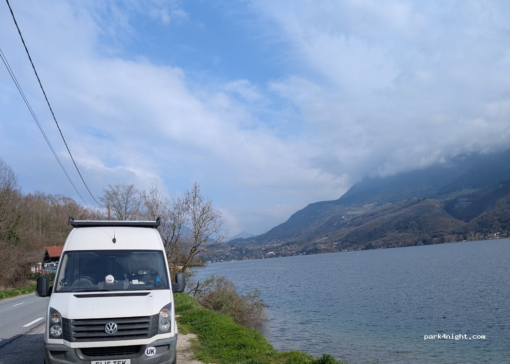 Large layby right on the edge of the lake, amazing views over the lake and sunrise. no signs prohibiting overnight parking. road can be quite busy but good for one night.