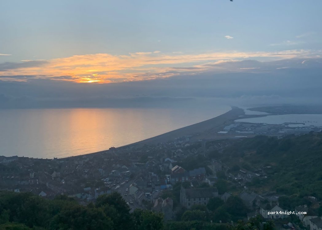 excellent view..if clouds allow. free to park. toilets near by and a café too.very high up ..long walk and very steep to Chesil beach if you are looking for exercise. a few other vans here.we loved it.