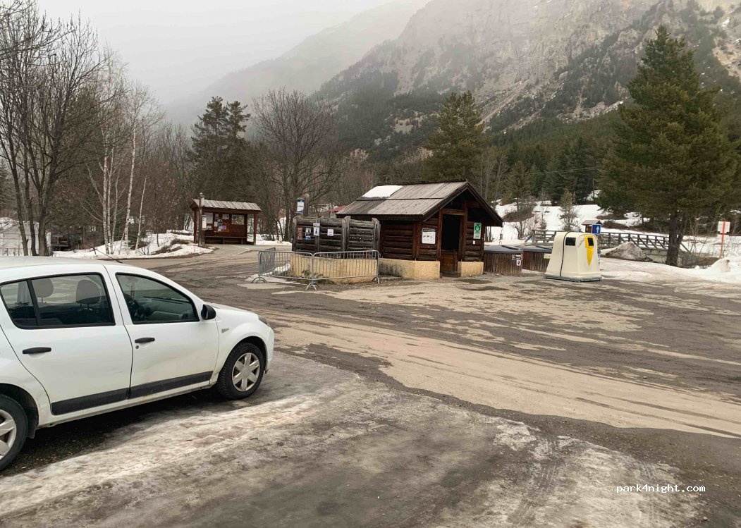Parking proche des pistes de ski de fond et départ randonnées, de la Riviere et d’un camping . Pas de barrière. Endroit calme . Poubelles à proximité. Les sportifs viennent s’y garer en journée.