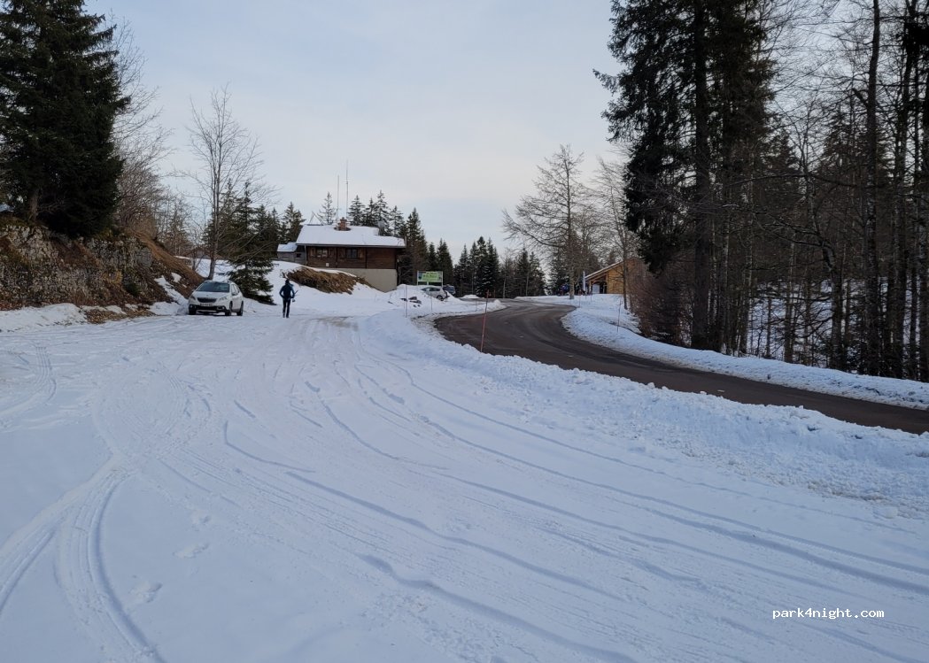 Parcheggio situato allo Chalet de la Bourre. Ideale per iniziare le ciaspolate e lo sci di fondo. Per chi fugge dai luoghi affollati dell'Alto Giura.