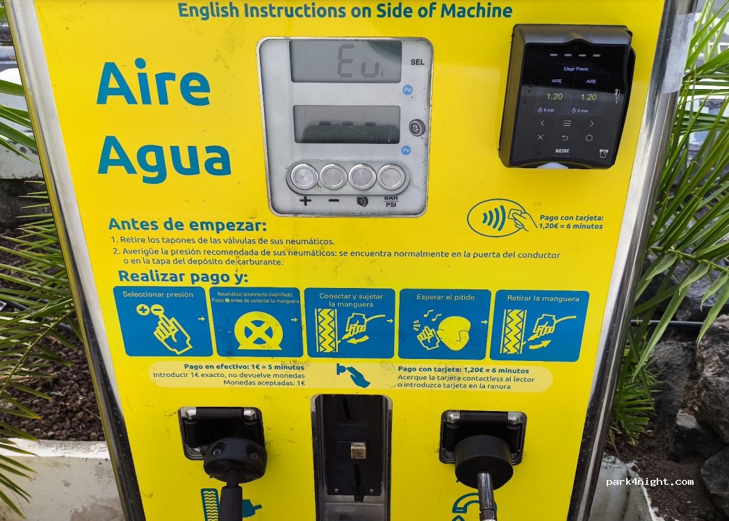 Máquina de 5 min para agua y aire, 1 euro pago efectivo y 1,20 pago tarjeta, poca presión (35L en 5 min aproximadamente).