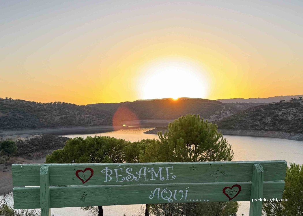 Mirador con bonitas vistas al embalse y al atardecer. El lugar es una explanada muy llano prácticamente al final de la carretera que lleva al embalse. No vi ninguna señal de "prohibido aparcar o circular" ni al principio de la pista ni donde aparqué como indica uno de los comentarios. Noche súper tranquila. Acceso fácil con Camper de gran tamaño. Recomendable.