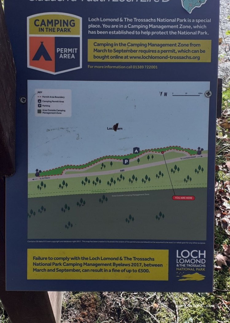 Il y a sur tous les parkings autour du lac des petits panneaux d'interdiction Après renseignements auprès d'un camping-car anglais (je ne parle que le français) il apparait qu'il est nécessaire d'obtenir une autorisation sur un site internet ??? je n'ai pas tout compris mais il m'a confirmé que je ne pouvais pas dormir ici Visiblement valable sur tout le Trossach parc, plusieurs panneaux le long de la route "zone management camping" A vérifier