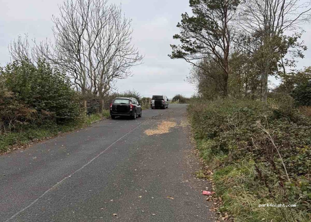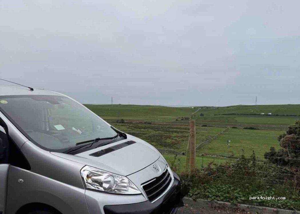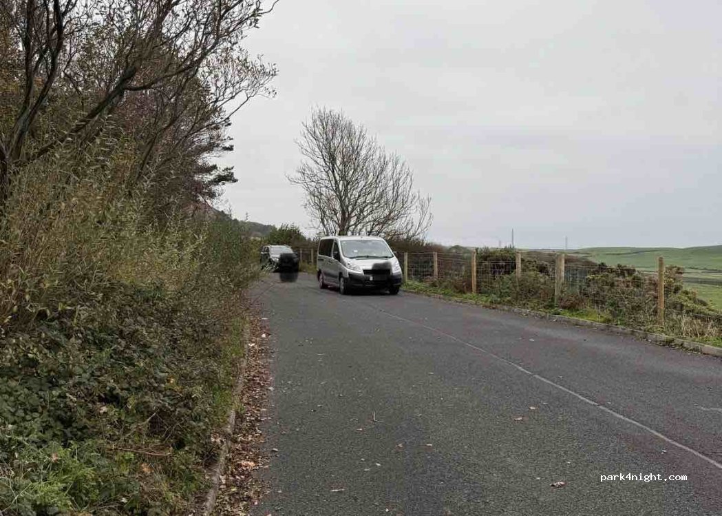 I like this place and spent several nights here while mountain biking. Room for several vans. No prohibited signs. Sheltered from the road by bushes. Road quiet at night. Open views over fields towards the sea.