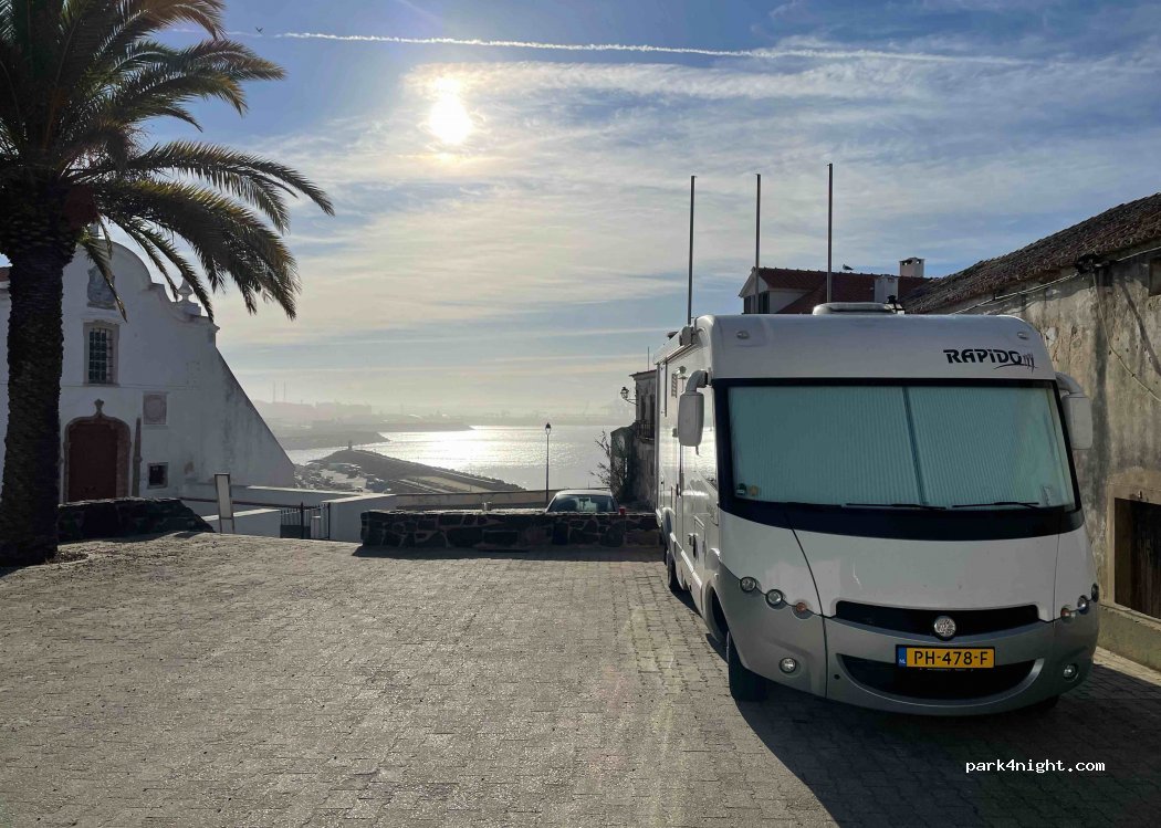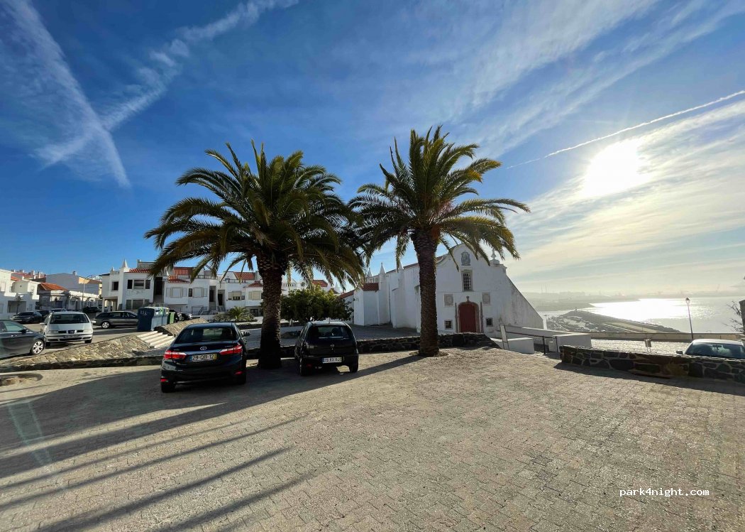 Mooi gelegen pleintje met uitzicht op de zeehaven. Pittoreske huizen en kerkje in stille buurt. Ideaal om het oude centrum van Sines te bezoeken en/of een rustige nacht door te brengen op doorreis.