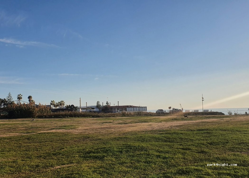 explanada bastante nivelada. ideal para quien quiera estar pegado a la playa en su furgo y ver los atardeceres, contenedores de basura y bares cerca para comer o beberte algo. no hay ruido de los bares. la guardia civil. paso varias veces y sin problemas
