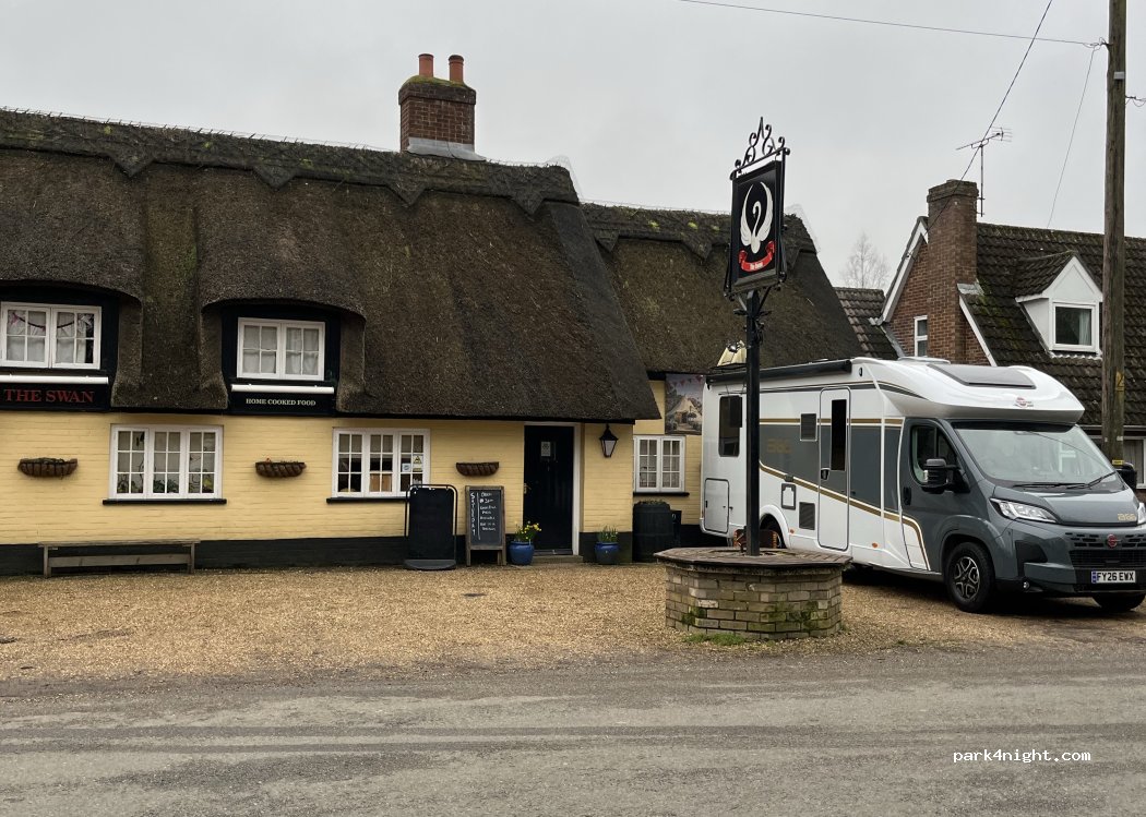 Swan Inn Lawshall offer a car park for you to park your motor home. The pub is closed on a Monday and Tuesday. Lunch and Dinner available Wednesday through to Sunday. Free overnight parking if you please use the pub to purchase a meal. Please phone ahead.