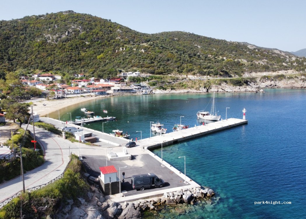 Wunderschöner geteerter Platz am ruhigen kleinen Hafen(kein Betrieb). Glasklares Wasser,toller Blick auf den Berg Athos. Sehr ruhig,keine Menschen,keine Hunde,nur 3-4 Katzen. Für Leute die Ruhe lieben ! Wir waren am 26/27.11.23 da.