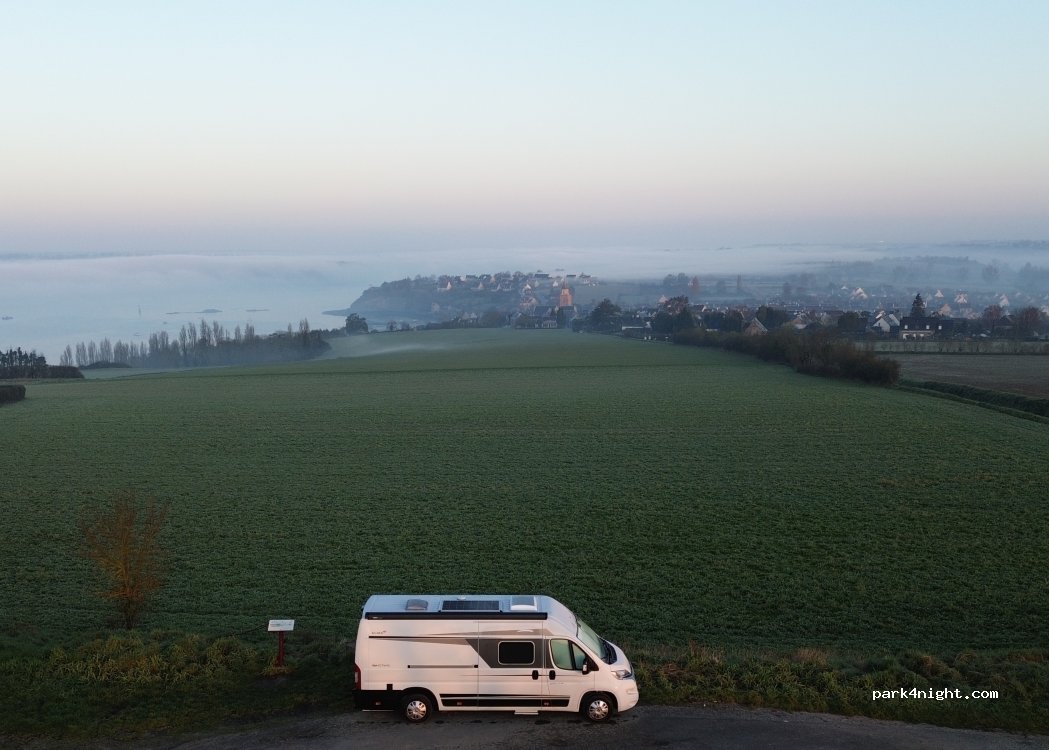 petit spot en altitude 73 m, donc il peut y avoir du vent. la vue est magnifique il y a des possibilités de balades. la nuit a été tranquille même si en début de nuit l'un des 6 camping cars avait le son de sa télévision bien trop fort peut-être un malentand (??). Ce lieu est propre et doit le rester afin pouvoir à nouveau le fréquenter il gratuit mais sans service.