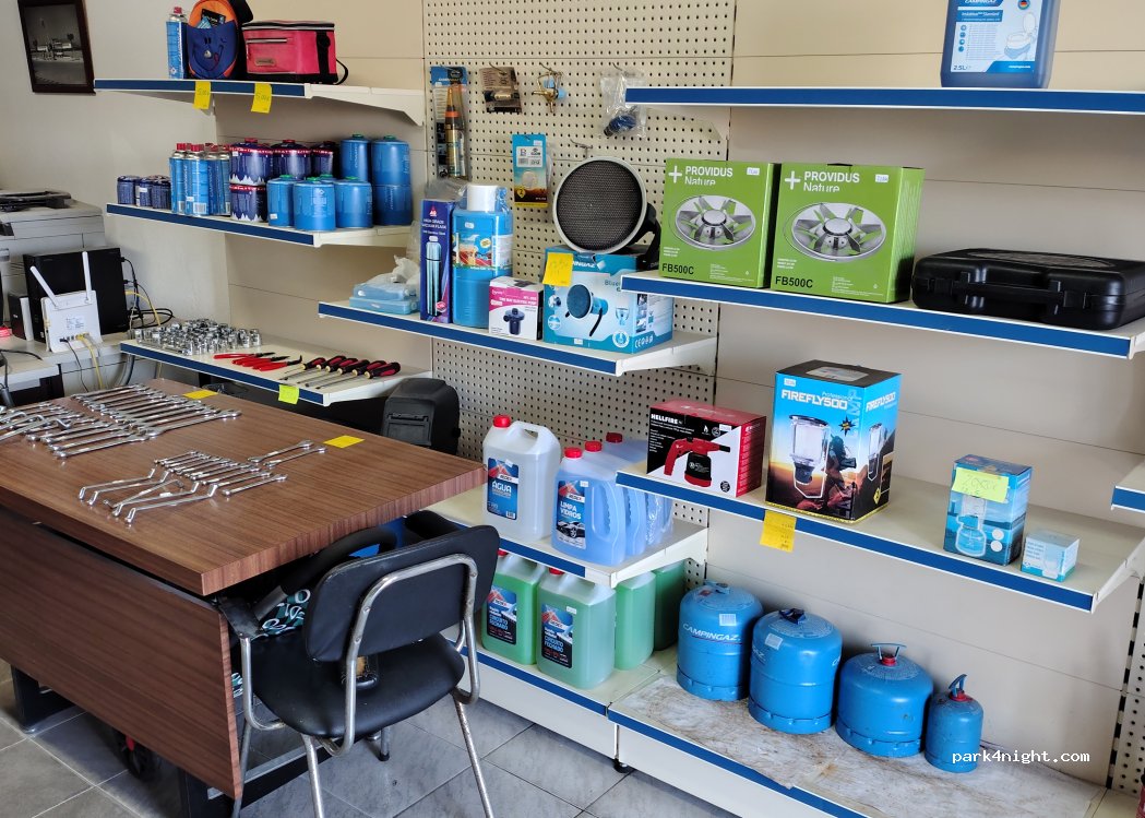 They have camping gaz 907 refills available for €13. And toilet chemical. If the door is not open you ask at the Repsol garage and they will open it for you. Very helpful place