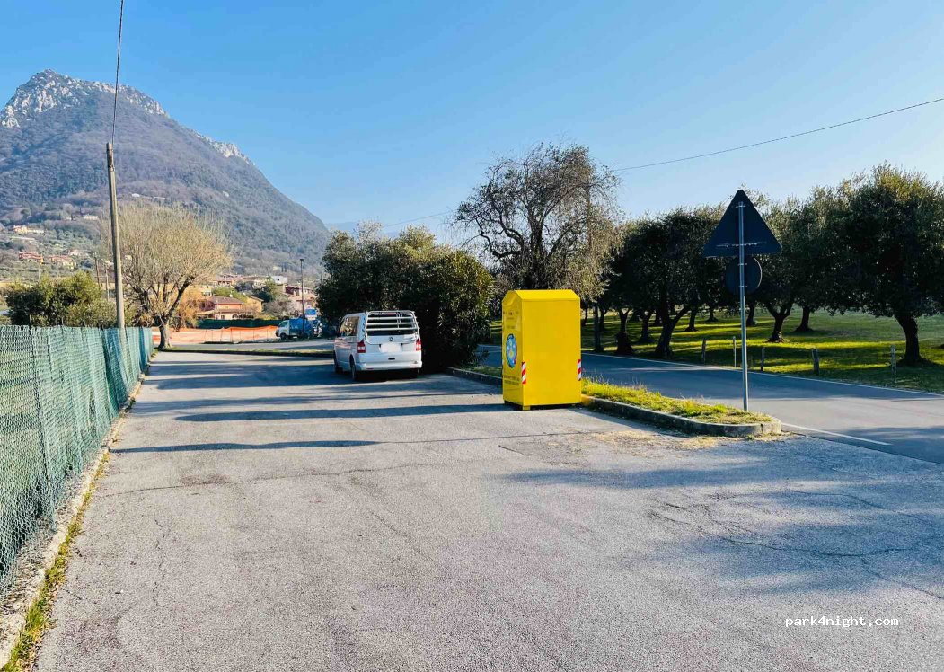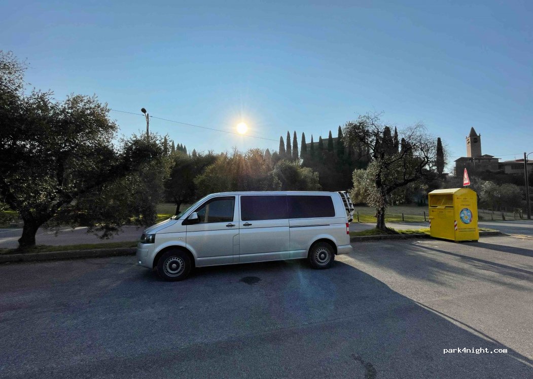 Easy parking next to olive grove. Is somewhat separated from the road by a green strip with olive trees. Easy to find thanks to the yellow container. A minute walk to the church with incredible views. An alternative to the meanwhile closed meadow next door.