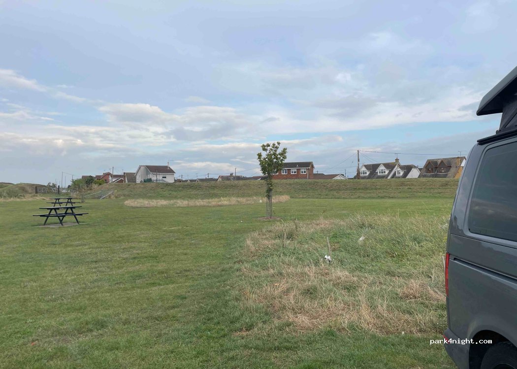 Great spot for the night. With easy accessible dog walks by golf course and sea wall. I stayed one night in order to visit a friend and it was perfect. A few dog walkers about and the car park fairly busy in the day time due to pre school parents using same car park. But nobody bothered me and it was lovely and quiet over night. Picnic benches and bins were a nice touch. Will stay again.