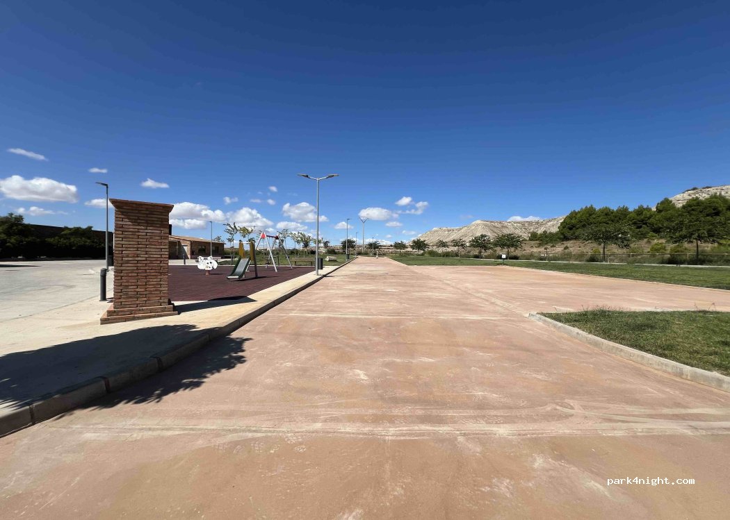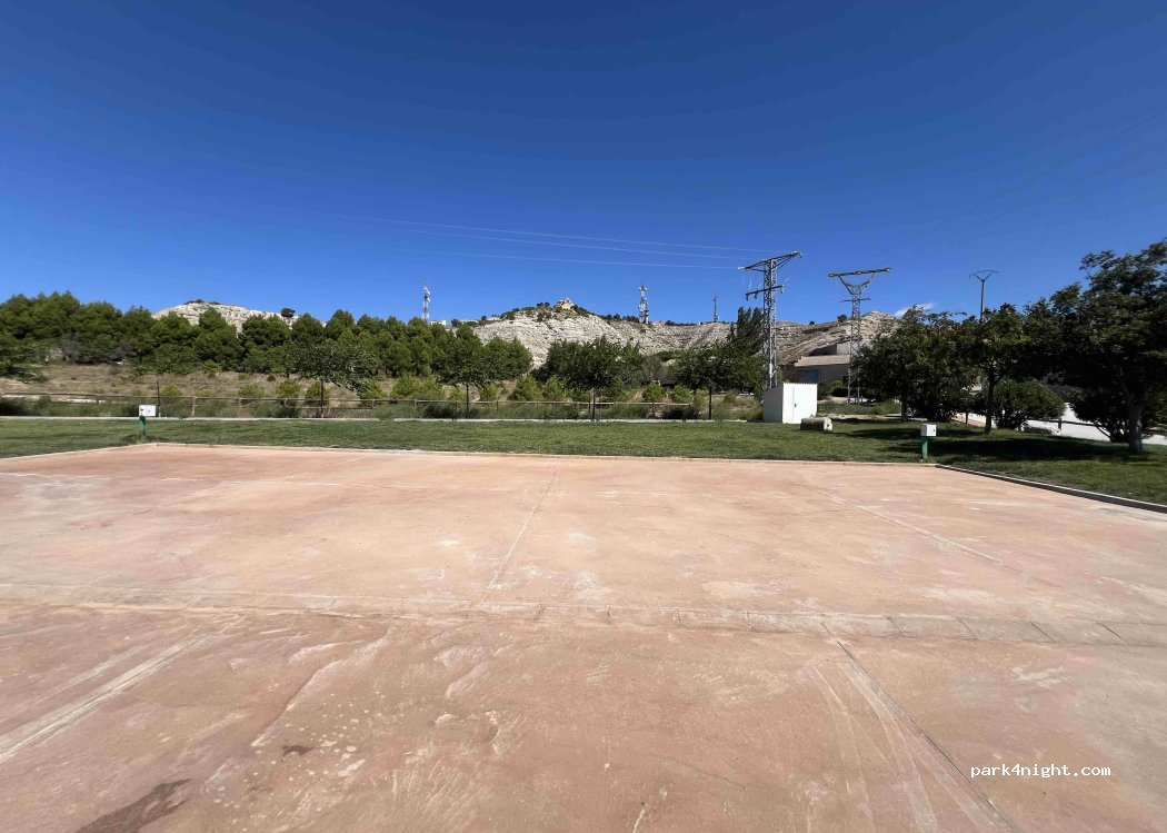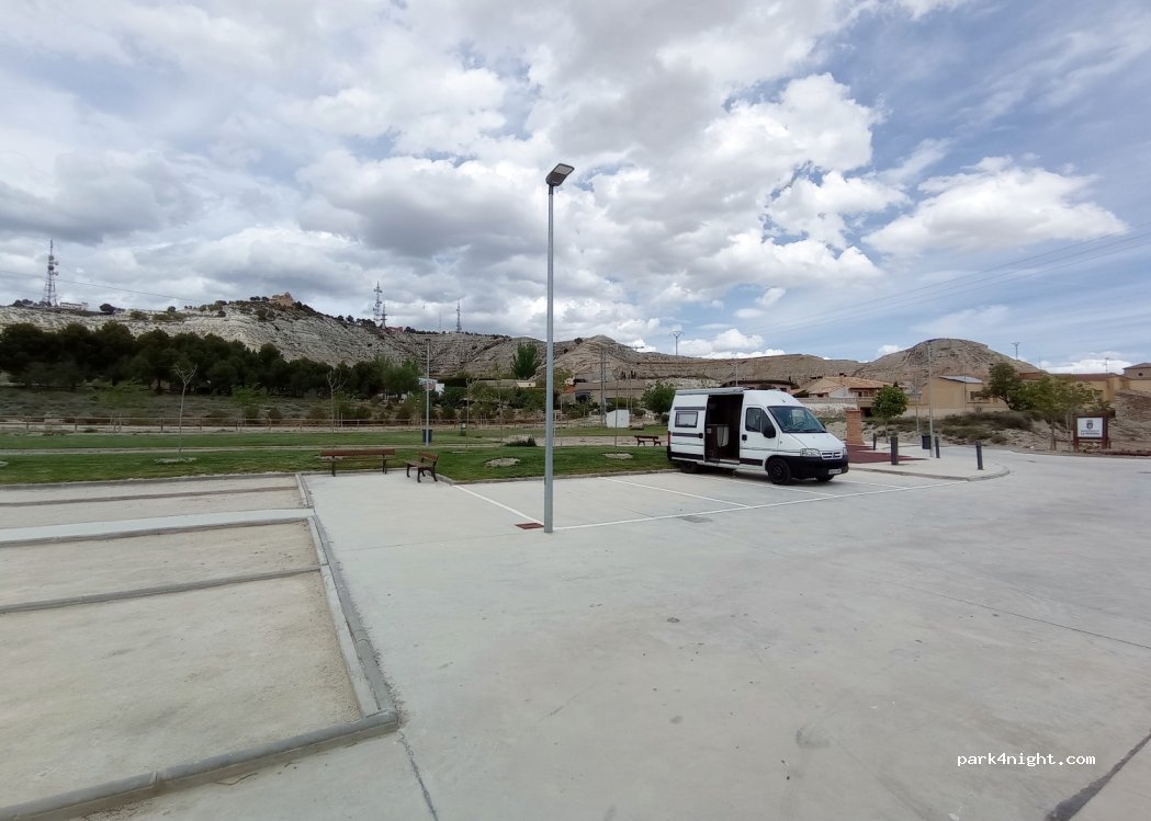 Free parking for 5 motorhomes/campers on a stone surface. There are free electricity points and views of the Monegros Mountains. There's a fountain in the playground and some paved car parking. Thanks to the town for this incredible place.