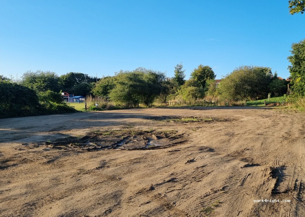 Ground behind paved car park. The car park has a sign for lorries, but nothing on the unpaved area, does have potholes. Burger van on site, got to be reasonable, on a permanent site. Supermarkets and laundry close by. Plenty of places to walk the pooch. Train station nearby. For good food, try the Station Bistro, not the cheapest but worth it.