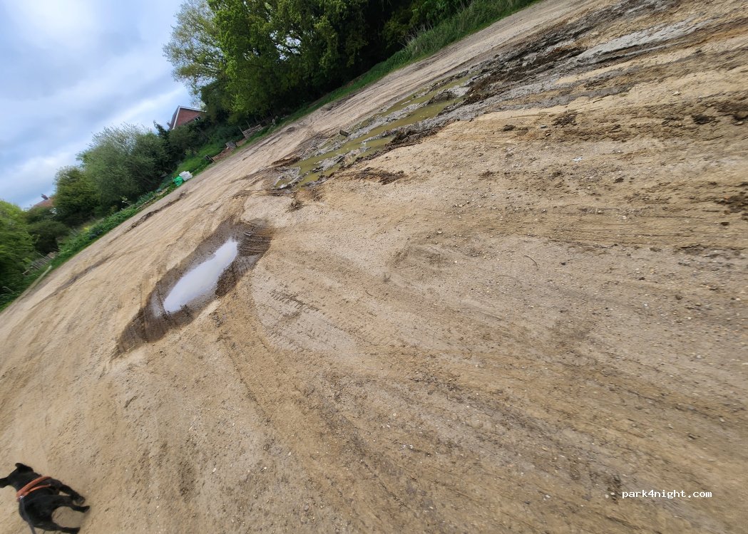 The pot holes have become craters. and does get muddy when it has rained. Go VERY slowly. There are some decent flat areas to the right side, furthest from the play park. Good signal on 3 network.