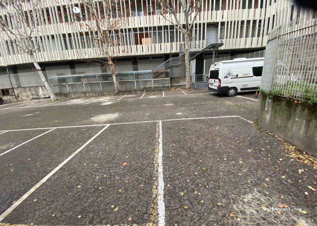 Fantastic parking in Bologna! 2 people on-site- always watching- sunken down with fence around. Felt very safe leaving Van. The streets are narrow with cars parked everywhere to get to, but no issues with 6m van. The attendant gave us a map of the city and was super sweet to our dog. Highly recommend!