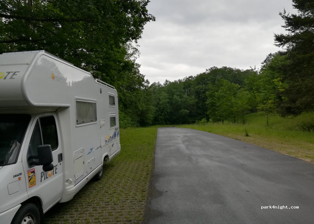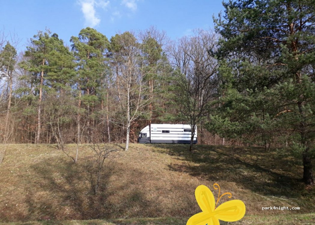 Beautiful gravel parking lot in the middle of the forest. very quiet. In summer it serves as a parking lot for the outdoor pool, so it is very popular. Is used by hikers all year round and is particularly recommended for autumn/winter. Restaurant just a few meters away. Easy to reach with large mobile homes.
