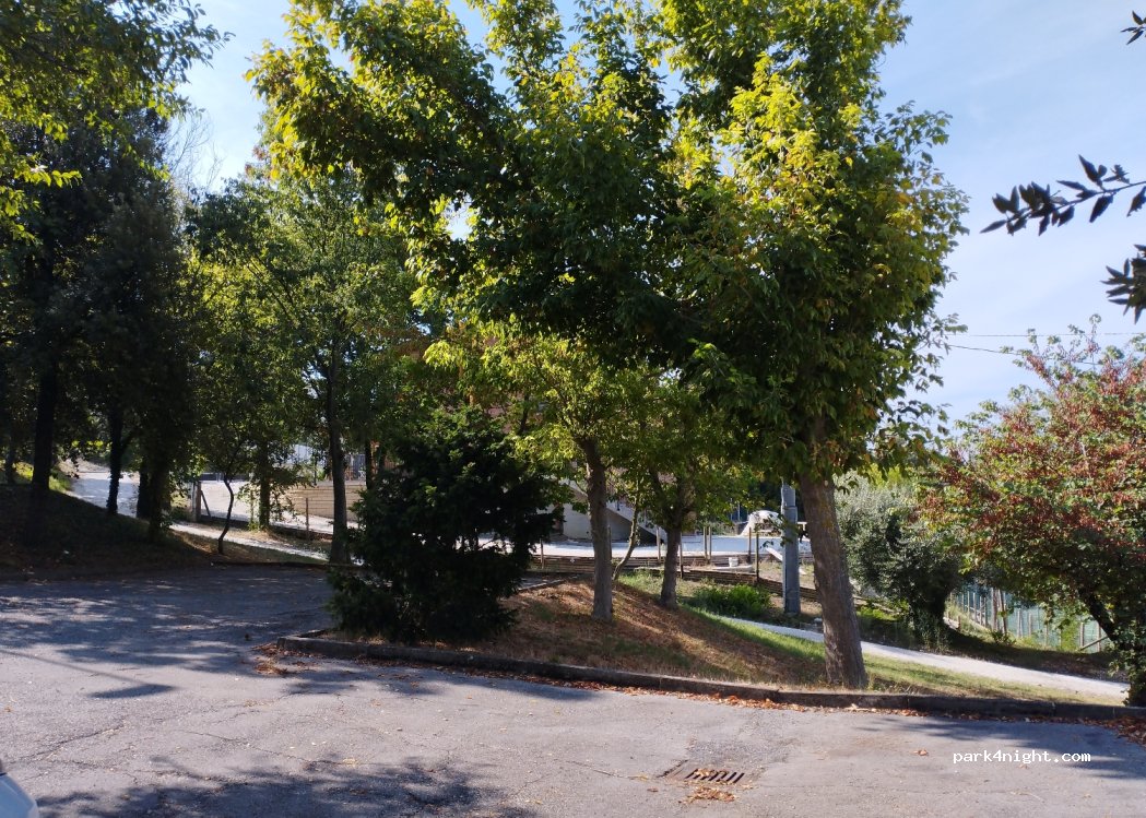 area sosta tranquilla e alberata su stalli asfaltati in piano. presenti colonnine per le prese elettriche e un rubinetto per l' acqua vicino allo scarico. subito fuori c'è un panificio con ottimi dolci pizze e pasta fresca. grazie alla municipalità che ci mette a disposizione posti come questo!!
