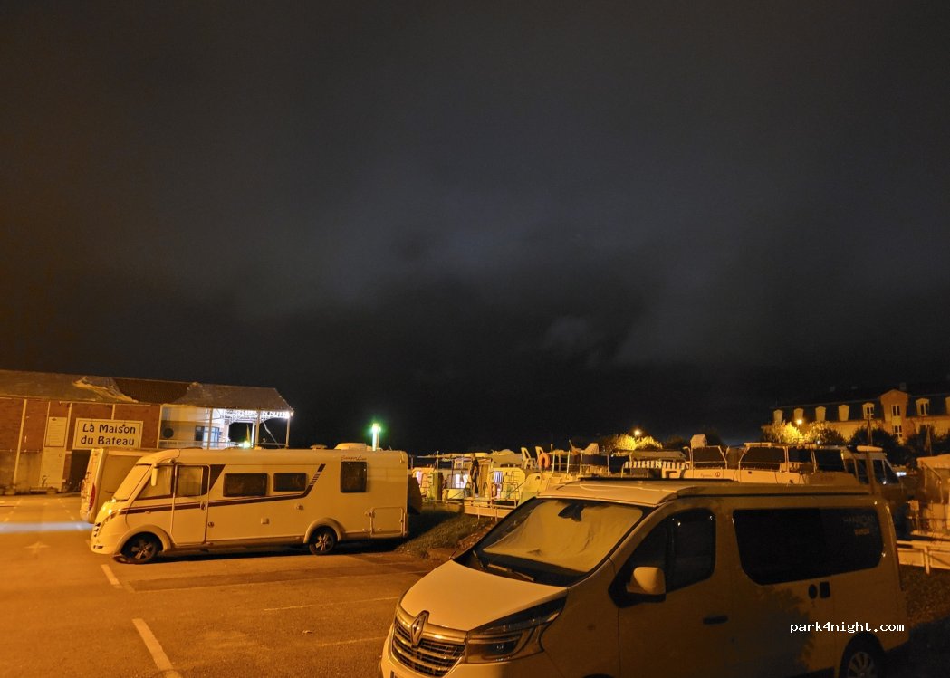Parking du port de plaisance, parking de jour et de nuit avec les voitures. Possibilité d'électricité et d'eau via les dispositifs pour les bateaux (voir avec le loueur Canalou ou La Maison des Bateaux au bout du parking). Dans le centre ville. 10 min a pied par le long du canal du Pont canal sur la Loire. Calme en ce moment en avril.