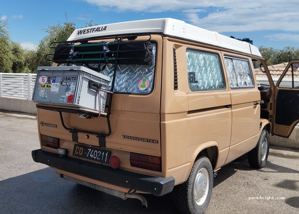 Out of season (31/03) and during the week (a Thursday) Large car park near the center of Mattinata, playground and trash cans nearby. 5min from amenities (bakery, supermarkets,...). A few other cars were temporarily parked. We stayed from 9 a.m. to 4 p.m.