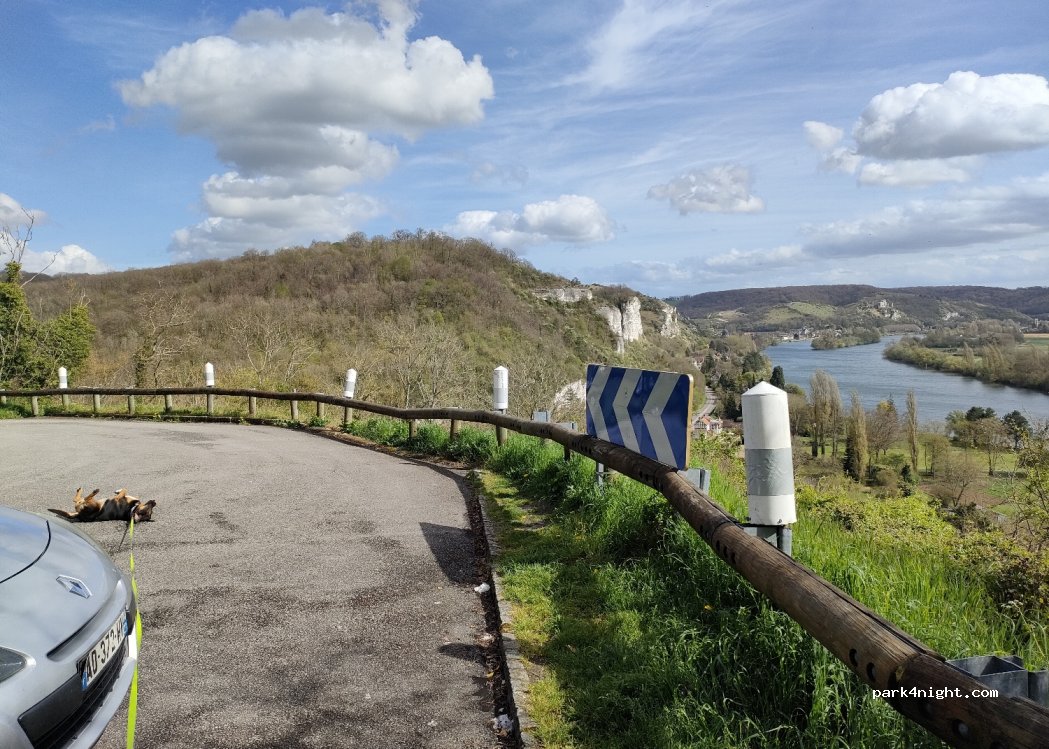 Petit parking en bordure de route, dans un virage. Beau panorama sur la Seine, bien pour une nuit. Un peu de circulation quand même.
