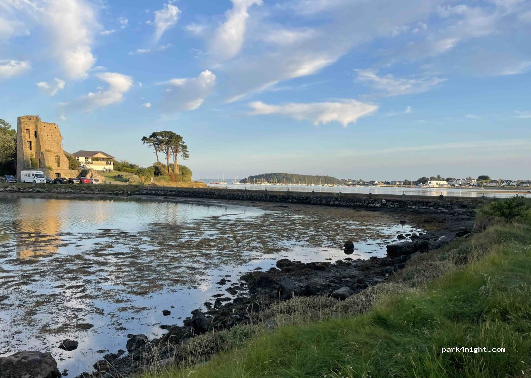 Stayed one night in front of Castle. Very quiet night. Food excellent at Daft Eddy’s. There is a larger car park before you cross the causeway. It has toilets and room for more vans. Would use again.