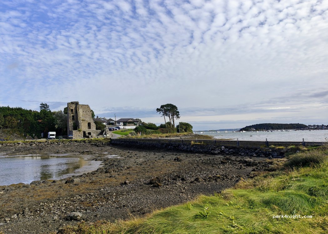 Sketrick Island parking for 3 to 4 Campers/Motorhomes below castle. Excellent restaurant on Island Daft Eddy’s, more parking and toilets on shore and water tap located at quay by lightship.