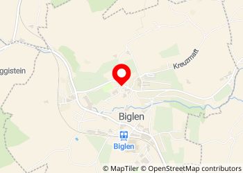 Parking dans l'ancien centre du village de Biglen. Dans une zone des années 30 à côté de l'école et de l'église. Le stationnement de nuit est toléré et le terrain présente une légère pente.