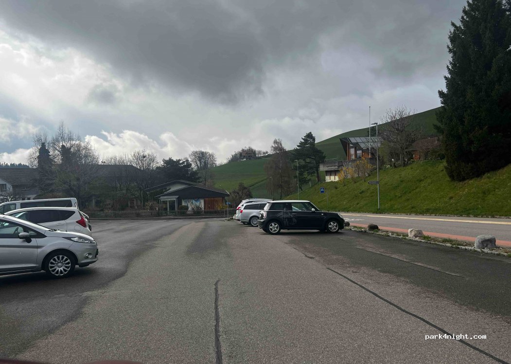 Parking lot in the old village center of Biglen. In a 30s zone next to the schoolhouse and the church. Overnight parking is tolerated and the lot has a slight incline.