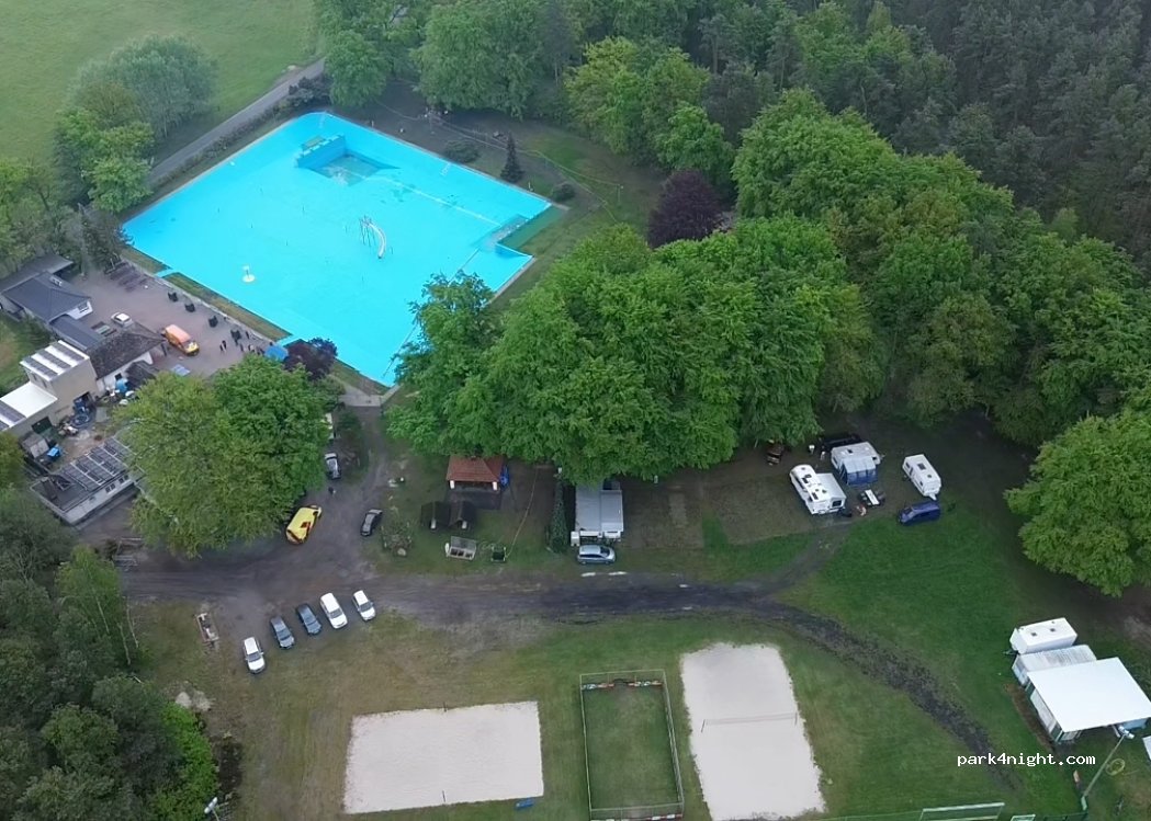 Es ist ein offener Stellplatz am Waldfreibad. Anmeldung per Email oder per Telefon. Pforte ist immer auf.