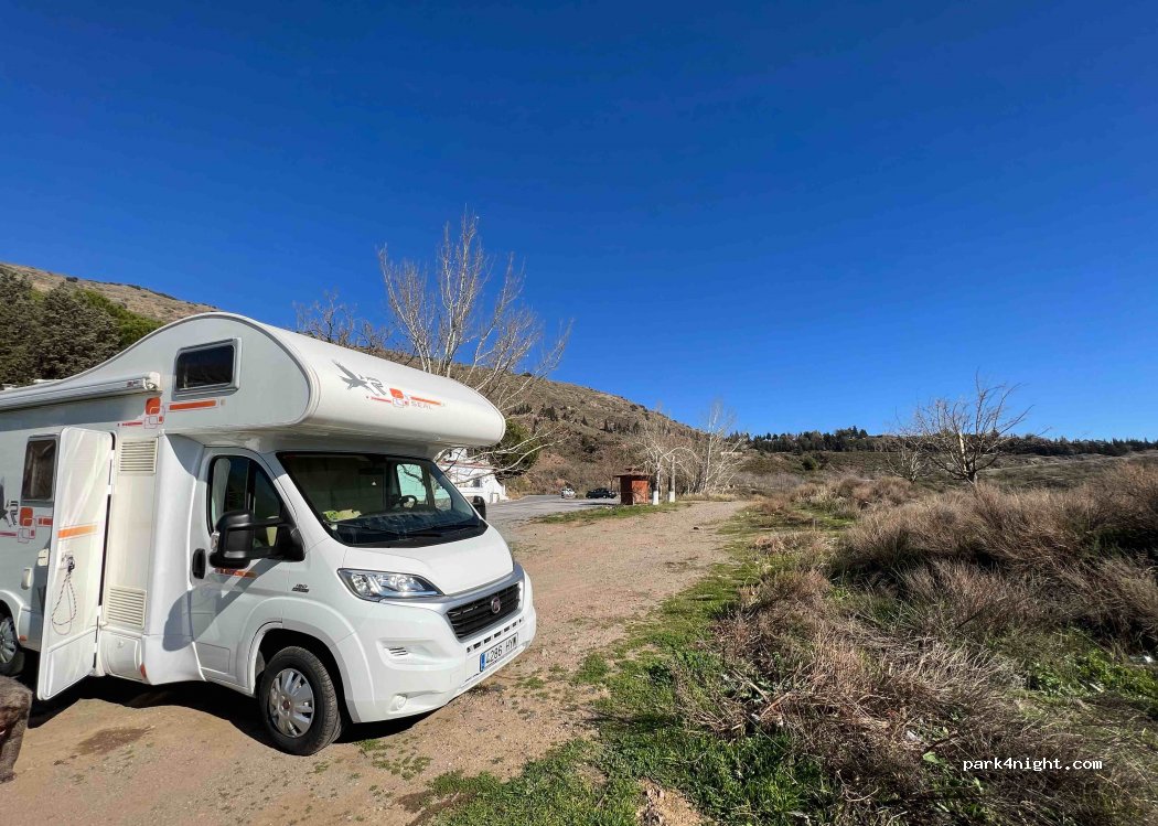 Hemos pasado aquí la noche y muy tranquilo. Es un descampado pegado a la carretera. Por la noche no tiene mucho tráfico, así que se puede dormir bien. Luego tienes Soportújar a unos 20’ andando. Al pueblo no se puede subir con AC. Para mi la mejor opción para visitar el pueblo.