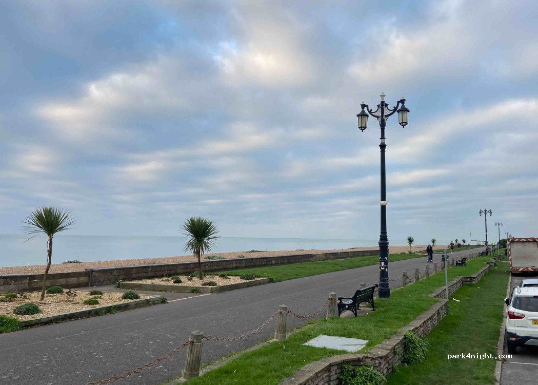 Great spot for the day, free parking for the beach and a short walk to worthing town centre. Public toilets closes at 9pm. Dogs are allowed to go on the beach where we parked in between sea view drive and grand drive. Looks like there is no parking restriction for night stoppers. Highly recommend.