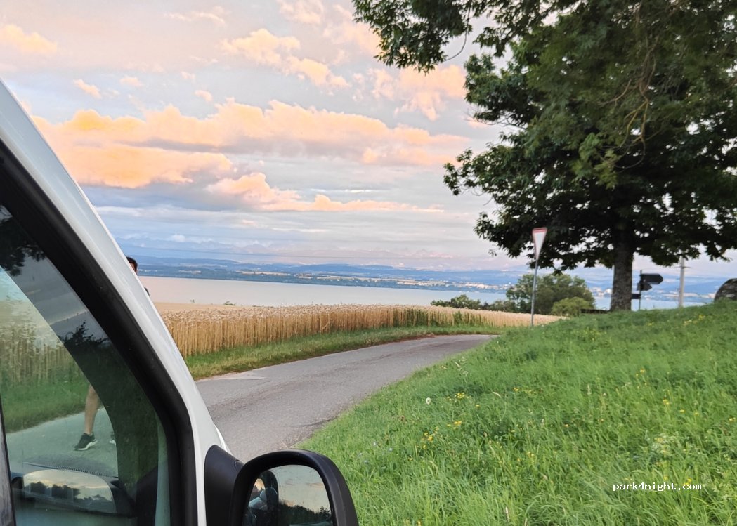 Gratis parkeren (dag en nacht). Prachtig uitzicht op het meer van Neuchâtel. Er zijn een paar huizen in de buurt, maar erg rustig. Prachtige bloemenvelden in het voorjaar, die het decor perfect maken.